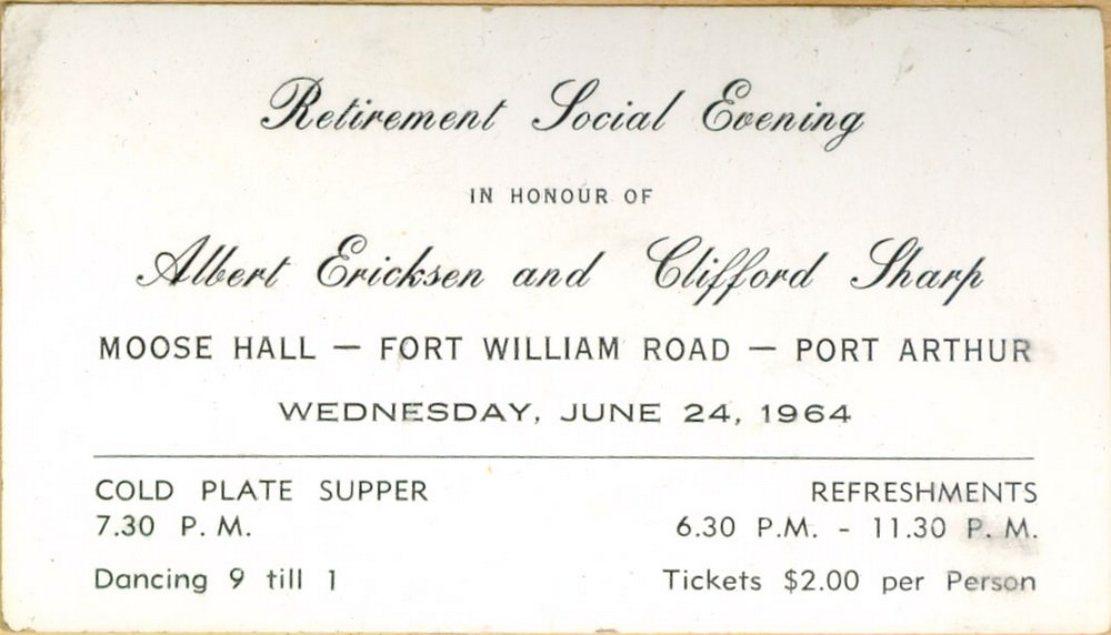 Clifford Sharp shared a close relationship with the officers he worked with throughout his career. He and Corporal Albert Ericksen had a joint retirement party on June 24, 1964 at the Moose Hall in Port Arthur. Tickets were $2 per person and there was dancing from 9 p.m. to 1:00 a.m.!
