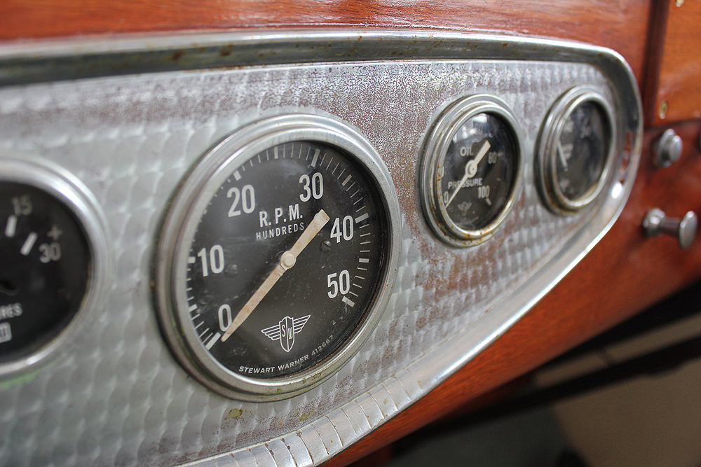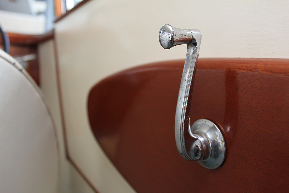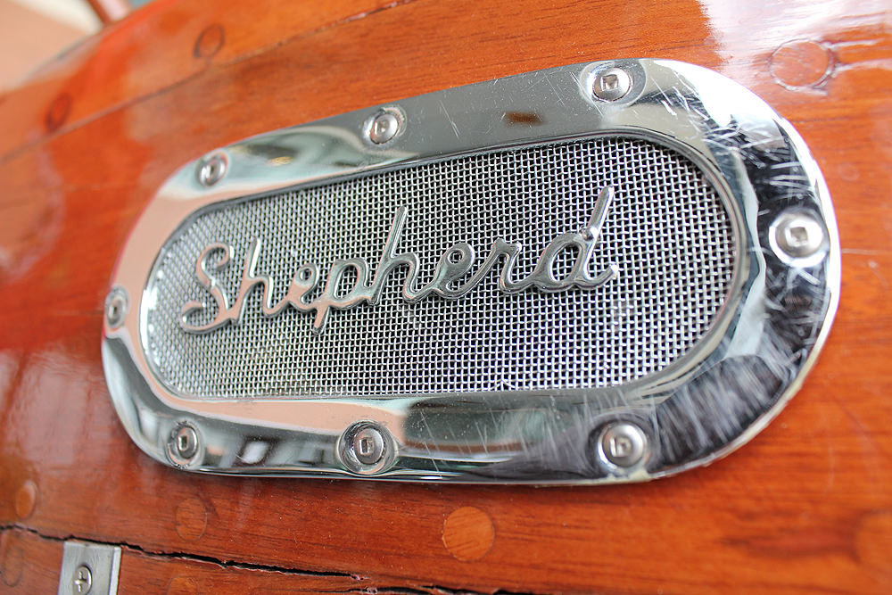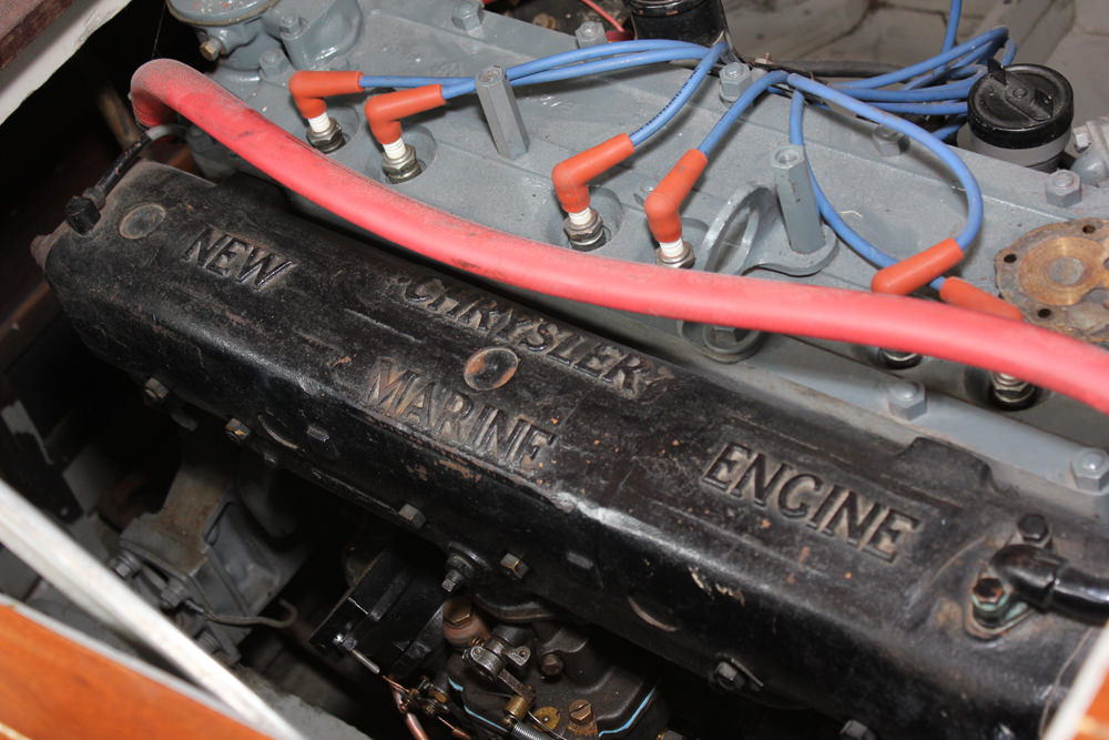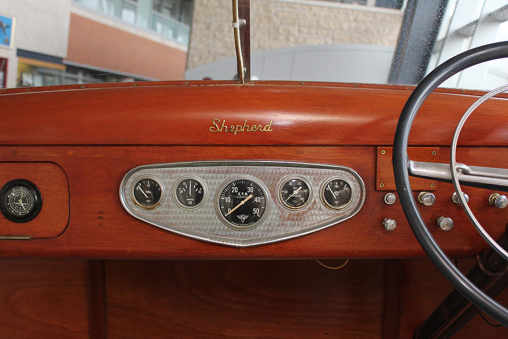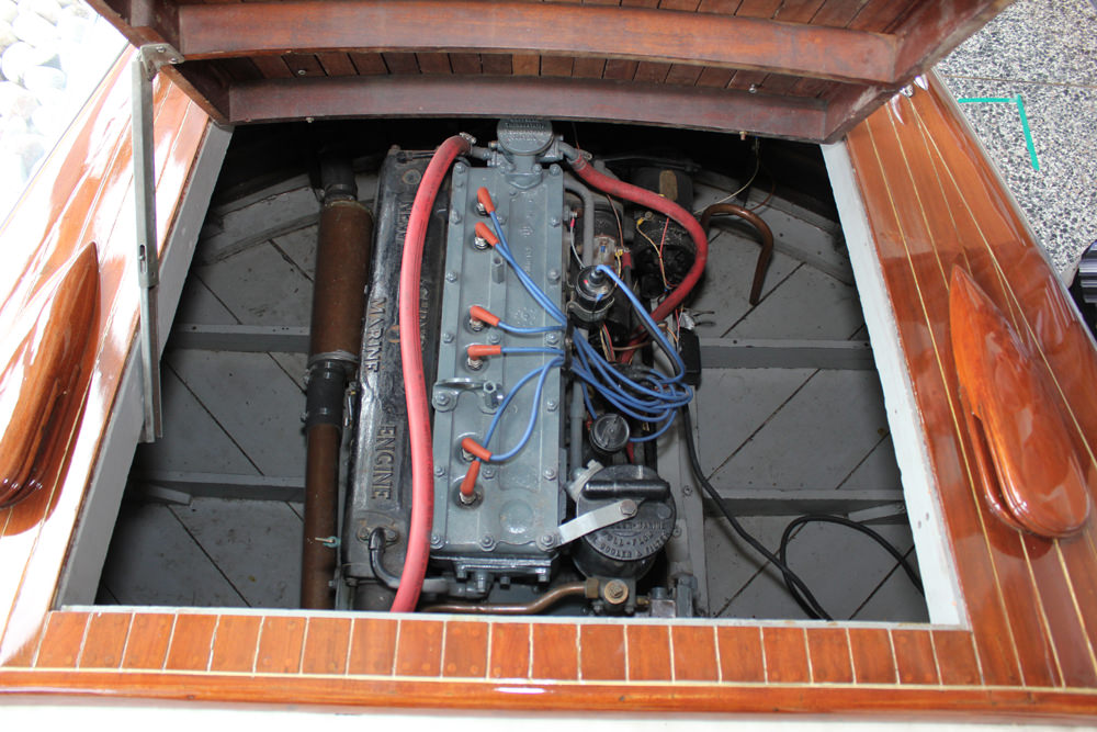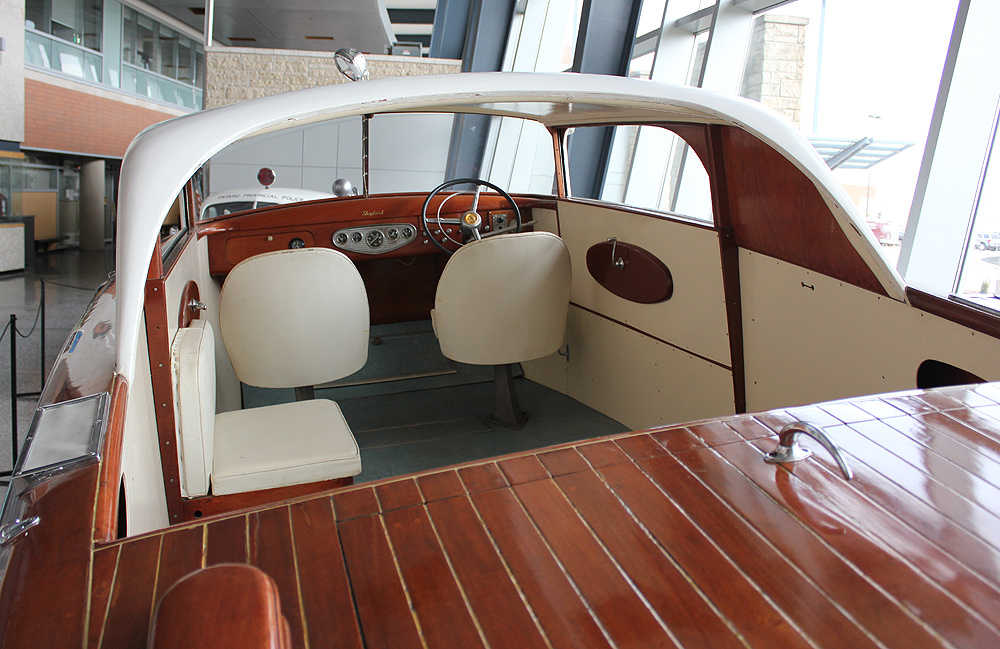 With its original siren, brass tipped pole for pulling up to the dock, fenders, life ring and even the original chrome name plate letters for the stern, Temagami remains in nearly identical condition from when it was taken out of service by the OPP and sold as surplus. Its original hefty 6 Cylinder Chrysler Vee Drive engine, said to be capable of speeds up to forty-five miles per hour drives the boat that operates with pedals and gears like a car.